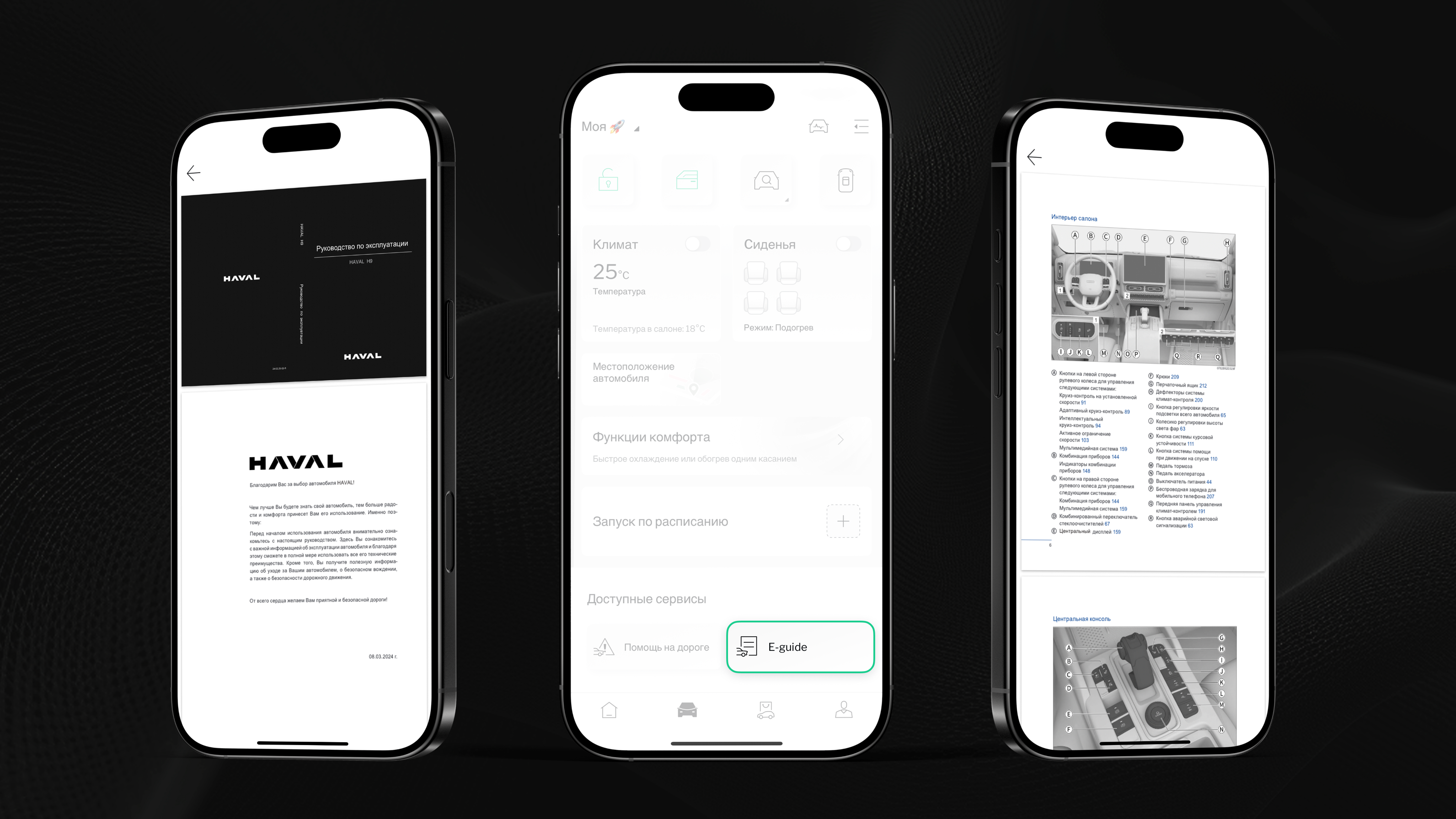 В разделе «Доступные сервисы» на экране управления автомобилем появилась кнопка 'E-Guide' для автоматической загрузки онлайн-руководства по модели, подключенной к учетной записи пользователя. Так был оптимизирован ручной поиск информации об автомобиле, система сама определяет модель и предоставляет актуальные данные.