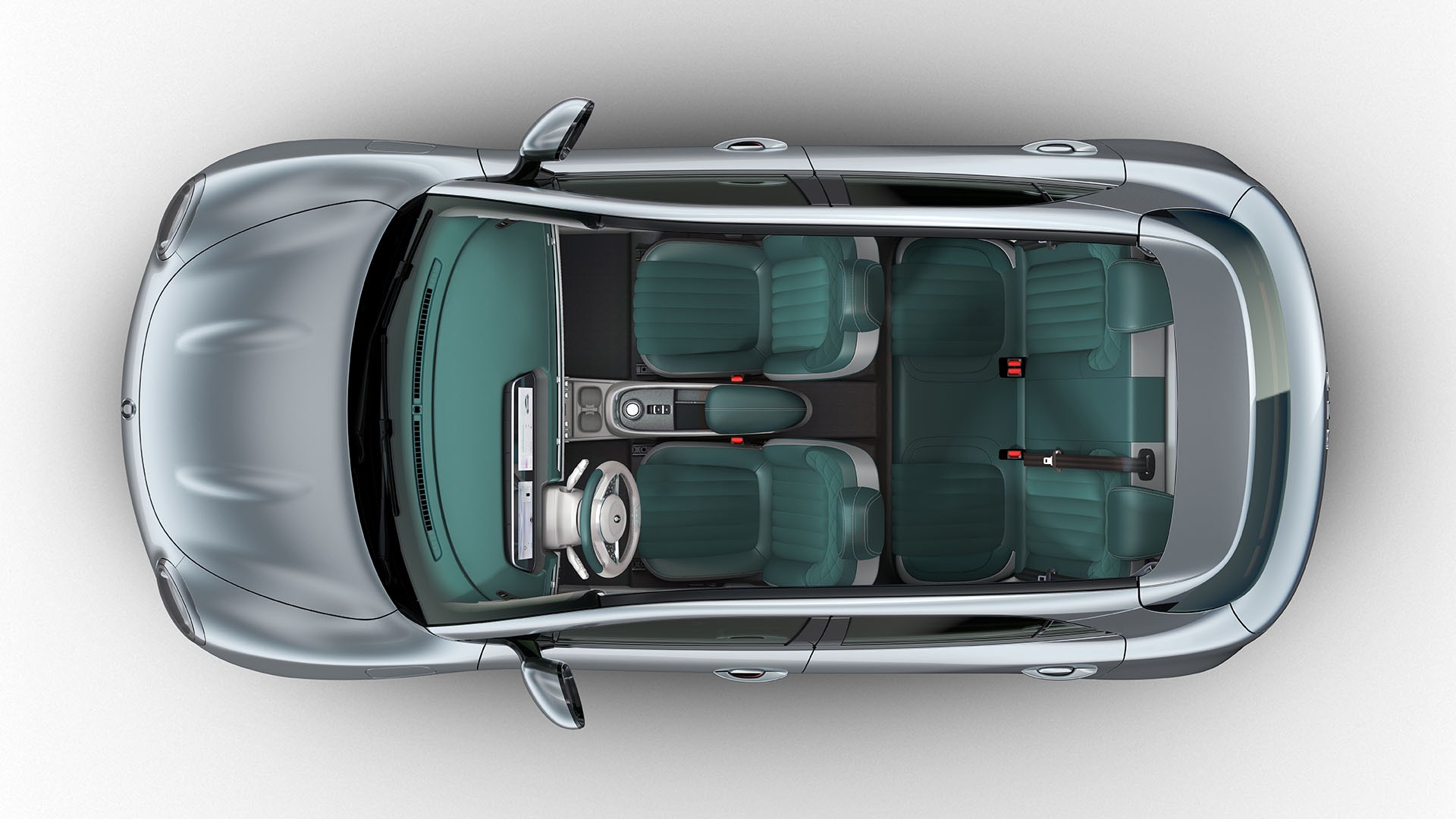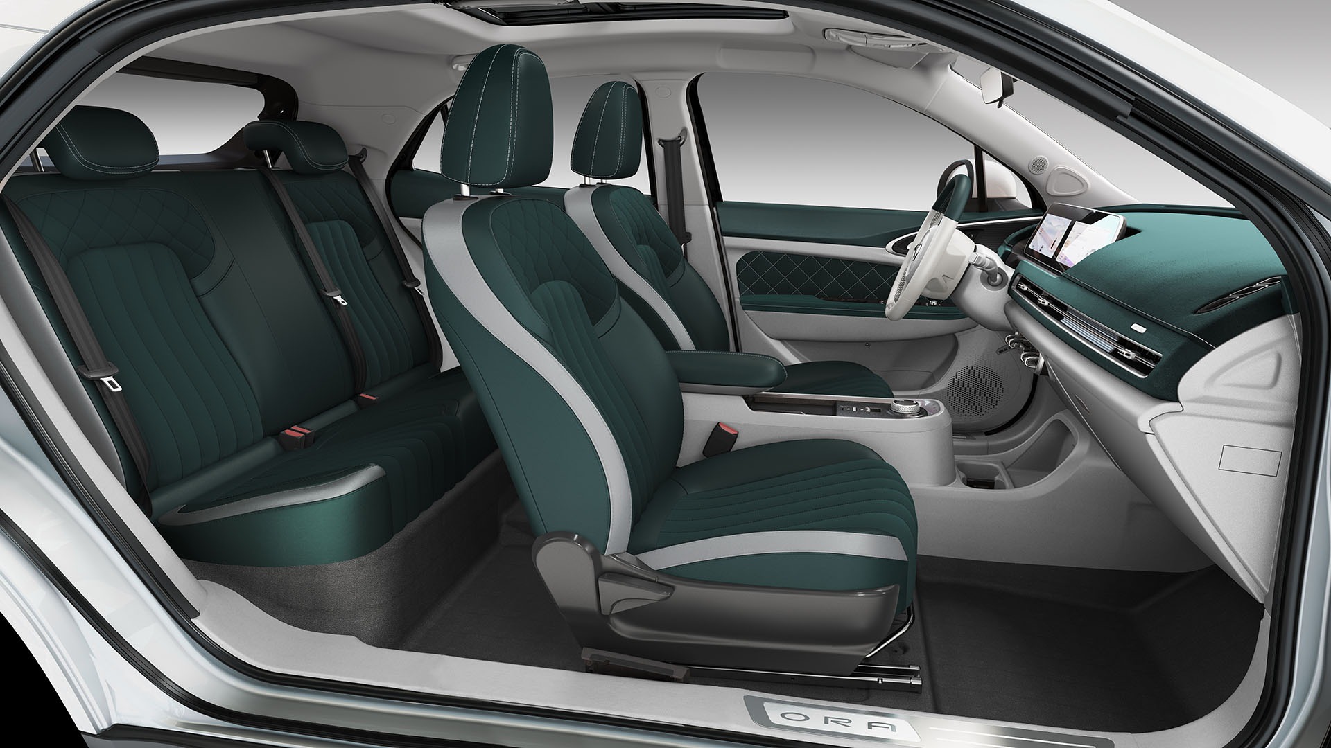 Несмотря на компактные размеры, в ORA 03 хватает места для пассажиров второго ряда. А если сложить сиденья, то багажное отделение приобретает внушительный объем в 858 л.
